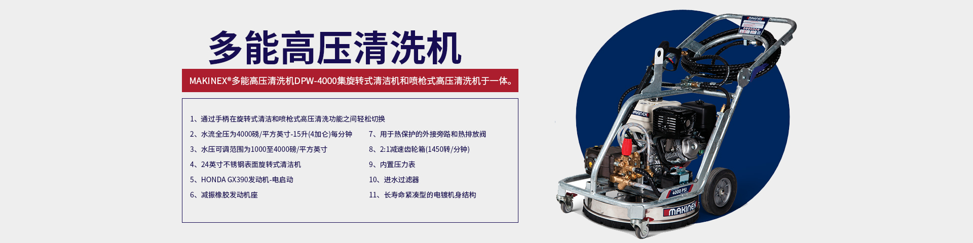 Makinex多能高壓清洗機(jī)DPW-4000具有無(wú)可比擬的多用性。雙清洗機(jī)功能和可調(diào)節(jié)的水壓使其完美適用于重型外部清潔應(yīng)用…